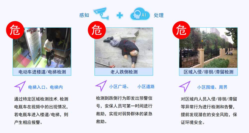 在智慧社区的管理中,通过应用各种智能AI识别技术,可以有效应对和处理多种场景和问题。以下是针对智慧社区具体场景的例子: