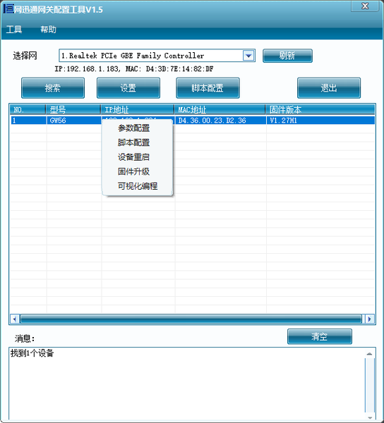 点击“搜索”按钮,如有系统弹出允许软件访问网络,应点击允许。如果网关正常工作,将可以搜索到网关设备(支持跨网段搜索)