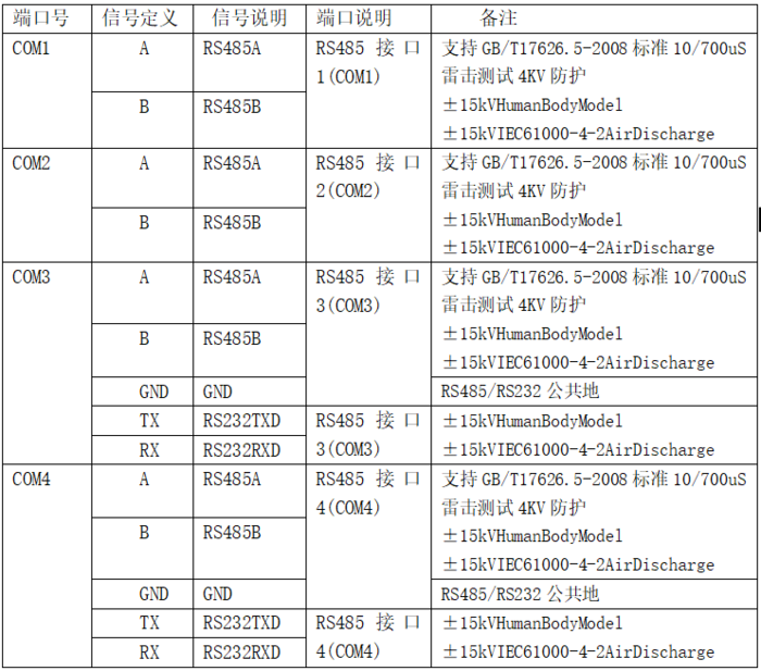 网关对外总共有4个串口分别为COM1~COM4,对外4个RS485接口全部采用完全独立隔离电源设计。每一个对外RS485接口都和其它RS485接口完全电气隔离,并且RS485接口全部采用多级防雷防静电设计,非常适合对稳定性要求苛刻的工业与电力系统应用。接口采用标准14PIN5.08mm间距连接器,脚位定义如下表: